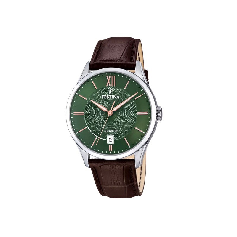 Montre analogue heure + date bracelet cuir marron fond vert F20426/8